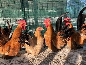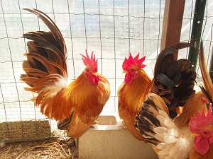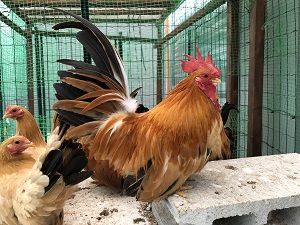 当社のチャボは血統を選りすぐった、特に小柄で短脚、尾羽が直立した品評会に出したいほどの美しいチャボたちです。
