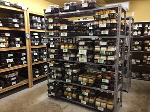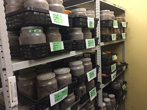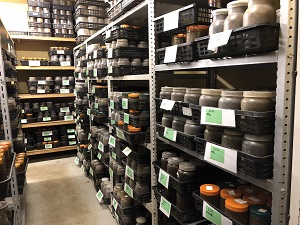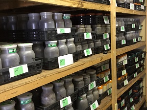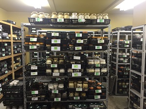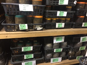 クワガタ専用ルーム内の棚は飼育ボトルで埋まっています。 年間で成虫約5,000頭程度のクワガタを養殖・出荷をしています。