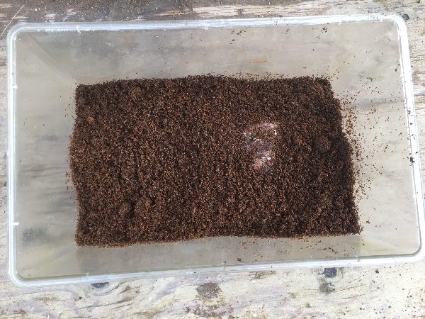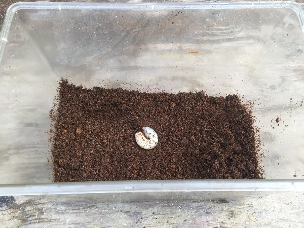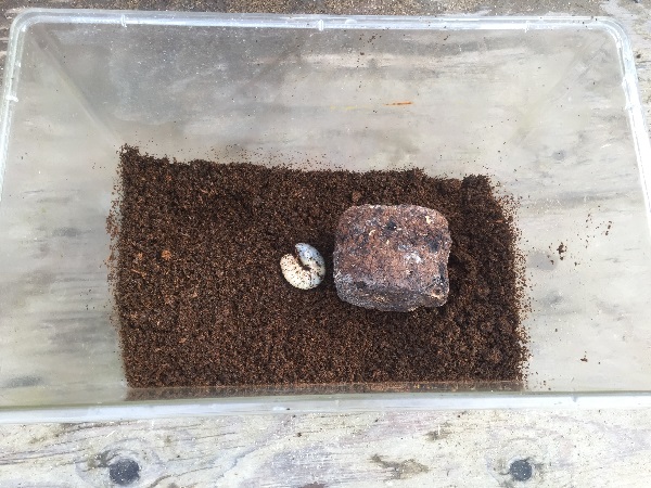 1、ケースの底に5cm程度、国産カブトマットを敷き、国産カブトムシの幼虫を入れます。