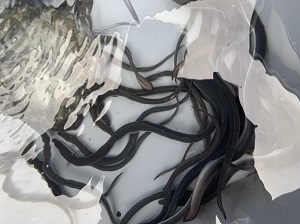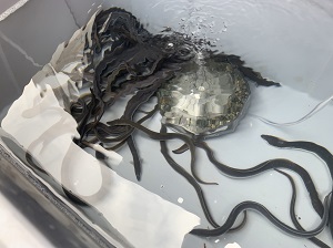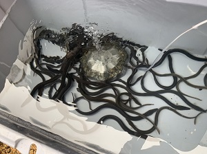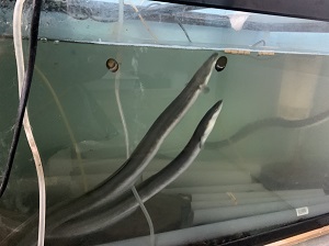 右の画像は人間の手からエサを食べる成長したニホンウナギです。1年程度で60cmほどのおいしそうなウナギに成長します。
